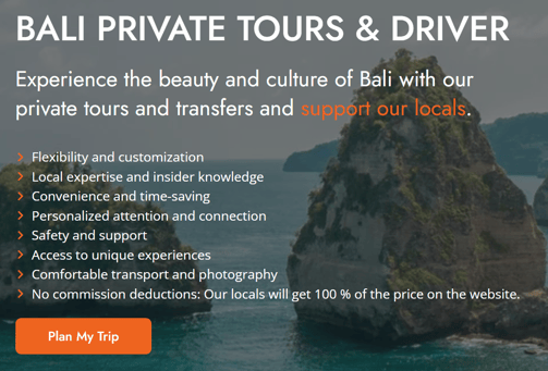 Entwicklung einer responsiven Website, die es Nutzern ermöglicht, Touren und Flughafen Transfers in Bali direkt bei Einheimischen zu buchen, ohne dass die Locals Provisionen an große Reiseportale abgeben müssen.